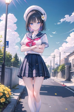 Ultra-clear, ultra-detailed, ((detailed depiction)), ultimate picture quality, CG,8k Wallpaper,(((masterpiece))), (((best quality))), ((ultra-detailed)), 1girl,black hair,black skirt,blue eyes,blue flower,bouquet,cloud,cloudy sky,crossed arms,dutch angle,evening,feet out of frame,flower,grey shirt,high-waist skirt,holding,holding bouquet,hugging object,legs apart,long bangs,looking at viewer,orange flower,outdoors,plaid,plaid skirt,pleated skirt,purple flower,reflective floor,road sign,sailor collar,school uniform,serafuku,shirt,short hair,sidelocks,sign,skirt,sky,skyline,solo,white flower,white sailor collar,yellow flower,