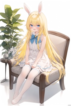 chen_bin,white background, yellow hair,blue eyes,long hair,white rabbit ears, full body, blush,open mouth,smile, white dress, thighhighs,bare arms, sitting,chair, white pantyhose