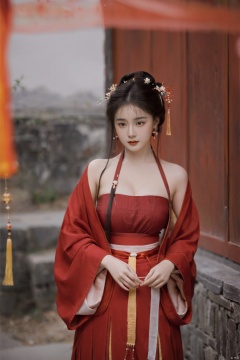 (masterpiece, top quality, best quality, official art, beautiful and aesthetic:1.2),gf-hd, 1girl, solo, hair ornament, jewelry,hanfu dress, red dress, earrings, chinese clothes, brown hair, ribbon, hanfu, red ribbon, shawl, song_hanfu,(big breasts:1.39), monkren
