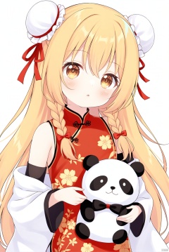1girl, loli, solo, long hair, looking at viewer, blush, bangs, blonde hair, simple background, long sleeves, white background, dress, holding, hair between eyes, bare shoulders, brown eyes, upper body, braid, flower, parted lips, detached sleeves, sleeveless, hair bun, twin braids, head tilt, double bun, sleeveless dress, chinese clothes, floral print, stuffed toy, stuffed animal, china dress, shawl, bun cover, panda
