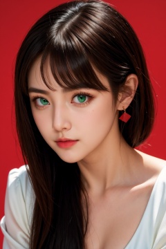 <lora:AgainEyes:1>,1girl,black hair,portrait,(white dress:1.2),green eyes,shining eyes,(red simple background:1.3),