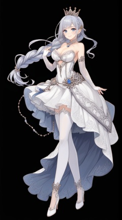 (best quality), ((masterpiece)), (highres), illustration, original, extremely detailed,   <lora:死の爱丽丝:0.7>1girl, solo, breasts, long hair, dress, white background, white dress, full body, simple background, pantyhose, looking at viewer, crown, white footwear, cleavage, bare shoulders, floating hair, bangs, jewelry, gloves, blue eyes, smile, white hair, large breasts, grey eyes, closed mouth, medium breasts, fingerless gloves, white pantyhose, high heels, see-through, elbow gloves, grey hair, clothing cutout, thigh strap, very long hair, shoes, white gloves, mini crown, braid, standing, no background