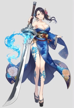 (best quality), ((masterpiece)), (highres), illustration, original, extremely detailed,   <lora:死の爱丽丝:0.7>1girl, solo, tattoo, breasts, weapon, sword, full body, okobo, japanese clothes, kimono, white background, large breasts, looking at viewer, jewelry, hair ornament, smile, earrings, sandals, cleavage, black hair, leg tattoo, holding weapon, flower, huge weapon, nail polish, hair flower, grey eyes, bare shoulders, platform footwear, holding sword