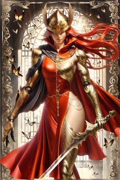 score_9, score_8_up, score_7_up, best quality, masterpiece, <lora:jijia-pony-Tanger-000006:0.8>, jijia, 3d, CG, 1girl, prosthetic arm, prosthesis, winged helmet, long hair, red hair, helmet, weapon, red cape, sword, solo, single mechanical arm, mechanical arms, holding, cape, holding weapon, very long hair, breasts, holding sword, prosthetic leg, dress, covered eyes, closed mouth, armor, bug, butterfly, a painting of a woman holding a sword, a woman in a gown is holding a sword,