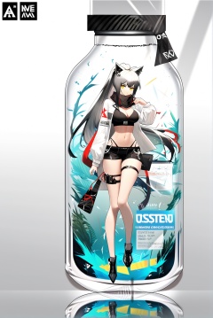 score_9, score_8_up, score_7_up, score_6_up, <lora:jijia-pony-Tanger-000006:0.8>, jijia, 2d, anime, schwarz \(arknights\), 1girl, solo, long hair, animal ears, cat ears, shorts, crop top, breasts, midriff, black shorts, yellow eyes, looking at viewer, grey hair, short shorts, navel, jacket, scarf, open clothes, in container, bangs, open jacket, black scarf, cleavage, stomach, long sleeves, see-through, thighs, standing, thigh strap, white jacket, hand up, character name, black footwear, ponytail, large breasts, grey background, reflection, very long hair, medium breasts, copyright name, bag, crossbow, gradient, a glass bottle with a picture of a woman on it, a picture of a girl inside a clear container with a bunch of stuff in it,
