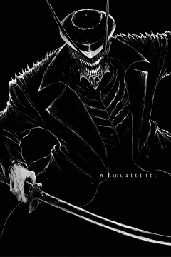 score_9, score_8_up, score_7_up, best quality, masterpiece, <lora:jijia-pony-Tanger-000006:0.8>, jijia, 2d, anime, weapon, sword, teeth, 1boy, sharp teeth, solo, coat, black coat, male focus, black background, holding, hat, holding weapon, holding sword, open mouth, monochrome, black headwear, jacket, simple background,a picture of a monster with a knife sticking out of its head,a close up of a very scary and evil looking villain with a knife through his eye