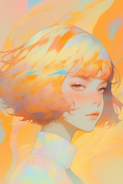 ghibli ,(1girl ), ,,lip, hairpin,custard, copper gradient background, Psychedelic hair,Short bob hair, Supple ,Contemporary ,Dusan Djukaric, (masterpiece,best quality,niji style)