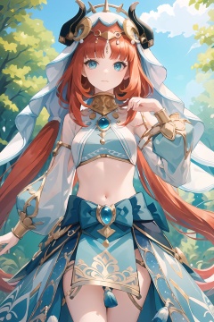 (masterpiece, best quality:1.2),insanely detailed,absurdres,ultra-highres,ultra-detailed,best quality,slender,kawaii,perfect symmetrical face,ultra cute girl,ultra cute face,ultra detailed eyes,ultra cute,ultra beautifu,<lora:nilou-000008:1>,nilou \(genshin impact\),1girl,veil,breasts,low twintails,nail polish,puffy long sleeves,jewelry,crop top,brooch,fake horns,gold trim,blue skirt,neck ruff,backless outfit,bare legs,headwear,tassel,forehead jewel,leg garter,gem,hair ornament,horned headwear,aqua eyes,outdoors,standing,back tattoo,