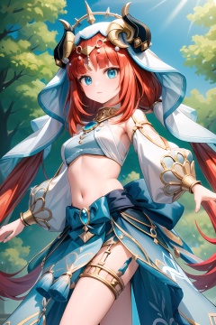 (masterpiece, best quality:1.2),insanely detailed,absurdres,ultra-highres,ultra-detailed,best quality,slender,kawaii,perfect symmetrical face,ultra cute girl,ultra cute face,ultra detailed eyes,ultra cute,ultra beautifu,<lora:nilou-000008:1>,nilou \(genshin impact\),1girl,veil,breasts,low twintails,nail polish,puffy long sleeves,jewelry,crop top,brooch,fake horns,gold trim,blue skirt,neck ruff,backless outfit,bare legs,headwear,tassel,forehead jewel,leg garter,gem,hair ornament,horned headwear,aqua eyes,outdoors,standing,