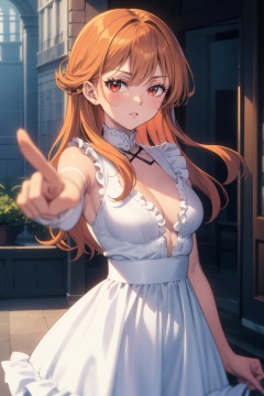 masterpiece, best quality, 1girl, solo, long hair, orange hair, red eyes, looking at viewer, soft focus, medium breasts, white dress, frills, center frills, blunt bangs, pointing at viewer, (1980s \(style\))