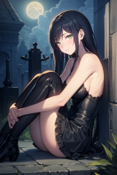 masterpiece, best quality, high quality, 1girl, solo, chibi, aged down, black hair, very long hair, green eyes, (glowing eyes), pale skin, black dress, frills, lace, texture, BREAK sitting, on floor, knees up, hugging own legs, horror \(theme\), ((night, darkness)), fog, graveyard, tombstone, against wall, from side
