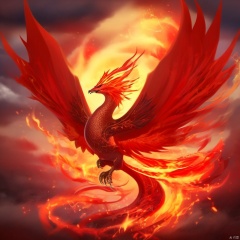 Alone, mouth open, horns, teeth, no one, glow, fangs, claws, clouds, lightning, scarlet birds, flame wings, flames