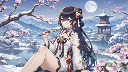 1girl, Baibohua, solo, black hair, hand fan, dress, white dress, holding, chinese clothes, holding fan, hair ornament, looking at viewer, jewelry, long sleeves, long hair, sitting, earrings, hair bun, full body a painting of a woman holding a fan in her hand and a tree in the background with a full moon, , branches on the moon, spring scenery of mangosteen, snow scene, picturesque landscape, small thoughts