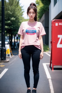 1girl, female focus, realistic, looking at viewer, outdoors, short sleeve sweatshirt pants, road, standing, shoes, full body, solo focus, ponytail, day, photorealistic, street,