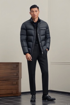 1man,solo,male focus,asian,exquisite facial features,handsome,muscular,down jacket,pants,footwear,standing,full body,(masterpiece, realistic, best quality, highly detailed,profession),jzns,brxu