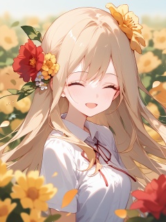 1girl, score_9, ^_^, depth of field, collared shirt, blurry background, red flower, hair ornament, flower, long hair, smile, open mouth, shirt, white flower, blush, hair flower, yellow flower, head tilt, blurry foreground, solo, white shirt, blurry, facing viewer, closed eyes, blonde hair, short sleeves, petals, :d, upper body