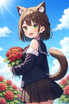 1girl, solo, flower, skirt, bouquet, rose, animal_ears, pleated_skirt, smile, tail, virtual_youtuber, looking_at_viewer, yellow_flower, green_eyes, shirt, white_flower, off_shoulder, holding, long_sleeves, jacket, bangs, holding_bouquet, :d, multicolored_hair, outdoors, white_shirt, brown_hair, hair_ornament, white_rose, looking_to_the_side, hair_flower, sky, puffy_long_sleeves, black_skirt, orange_flower, day, puffy_sleeves, fur_trim, sailor_collar, blue_sky, yellow_rose, brown_skirt, braid, open_mouth, brown_flower, animal_ear_fluff, wide_sleeves, red_flower, brown_jacket, white_hair, fur-trimmed_sleeves, standing, wings, red_rose