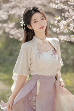 A girl,skirt,jewelry,long_hair,necklace,earrings,perfect body,standing,large breasts,looking at viewer,chinese clothes,china dress,hanfu,cherry_blossoms,in spring,sunny,sunny,wind,cloud,bright,