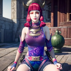 (best quality,masterpiece:1.2),ultra detailed,8k,RAW photo,realistic,photorealistic,ultra-detailed,intricate detail,extremely detailed,delicate pattern,looking atviewer,,1girl,solo,pink hair,horns,red eyes,makeup,lips point,lips tattoo,bangs,pink eyes,hair ornament,blunt bang,bare shoulders,detached sleeves,blet,shorts,fingerless gloves,gourd,sitting,