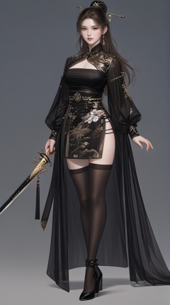 (best quality), ((masterpiece)), (highres), illustration, original, extremely detailed,   <lora:武侠与剑仙:0.7>1girl, solo, weapon, sword, long hair, thighhighs, jewelry, holding weapon, earrings, dress, high heels, holding, full body, holding sword, black dress, chinese clothes, hair ornament, black footwear, black hair, long sleeves, hair bun, looking at viewer, puffy long sleeves, black thighhighs, standing, breasts, side slit, single hair bun, grey background, simple background, puffy sleeves