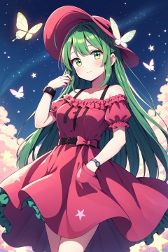 1girl, solo, butterfly, green hair, bug, long hair, kazami yuuka (pc-98), dress, pink dress, hat, pink headwear, short sleeves, green eyes, bow, puffy sleeves, nightcap, puffy short sleeves, flower, pink bow, looking at viewer, frills, star (sky), star (symbol), watch, holding, pocket watch, breasts, very long hair, bangs, sky, off shoulder, off-shoulder dress, frilled dress, starry sky, glowing butterfly, clock, star print, medium breasts, ripples, blush, closed mouth, frilled sleeves, feet out of frame, constellation, mob cap