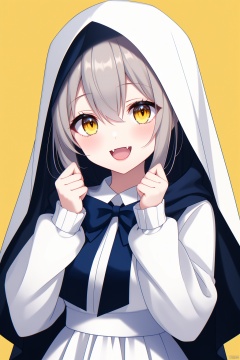 masterpiece,best quality,high quality,(colorful),1girl, solo, looking at viewer, blush, smile, open mouth, bangs, long sleeves, dress, bow, hair between eyes, brown eyes, yellow eyes, upper body, :d, grey hair, frills, fang, white dress, sleeves past wrists, hands up, black bow, blue bow, veil, sleeves past fingers, hood up, best quality, amazing quality, very aesthetic, absurdres
