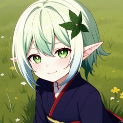 masterpiece,best quality,high quality,(colorful),[Artist miwano rag],[Artist toosaka asagi],[Artist wlop],[Artist chen bin],loli,1girl, solo, petite,loli,elf girl,pointy_ears, laurel wreath, evil_smile, half-closed eyes, close-up, looking at viewer, (chibi:0.1), on grass,leaf, meadow, from above, masterpiece,bestquality, white hair,green hair,green eyes,symbol-shaped pupils, bangs, breasts,cross-shaped pupils, hair ornament, gradient hair, hanfu, nahida (genshin impact),
