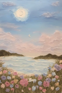 Healing_Painting,flower,oil painting,rabbit,sky,cloud,moon,beach,mountain