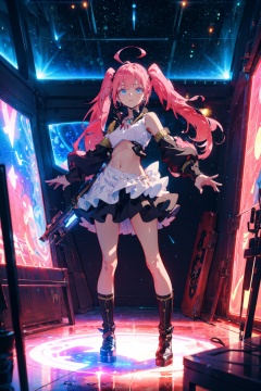 1girl,looking at viewer,solo,pink hair,long hair,ahoge,twintails,blue eyes,jewelry,necklace,small breasts,Aran sweater vest layered over a long-sleeved dress and knee-high boots,<lora:Milim (3):0.8>,Milim CYQL,panorama,beautiful face,beautiful eyes,glossy skin,shiny skin,Spaceship bed, Futuristic furniture, LED lighting, Galactic wall mural, Sci-fi collectibles,beautiful detailed sky,beautiful detailed glow,posing in front of a colorful and dynamic background,masterpiece,best quality,beautiful and aesthetic,contrapposto,female focus,wallpaper,fashion,