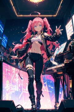 1girl,looking at viewer,solo,pink hair,long hair,ahoge,twintails,blue eyes,jewelry,necklace,small breasts,Airline-specific uniform showcasing the brand's logo and color scheme,<lora:Milim (3):0.8>,Milim CYQL,bust,beautiful face,beautiful eyes,glossy skin,shiny skin,Piano, Music stands, Amplifiers, Microphones, Soundproofing panels,beautiful detailed sky,beautiful detailed glow,posing in front of a colorful and dynamic background,masterpiece,best quality,beautiful and aesthetic,contrapposto,female focus,wallpaper,fashion,
