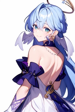 masterpiece, best quality, <lora:robin:1>,1girl, gloves, long hair, halo, solo, white background, dress, jewelry, blue eyes, earrings, looking at viewer, white gloves, looking back, bangs, simple background, bare shoulders, from behind, virtual youtuber, crescent, smile, bow, back, blue hair, hair between eyes,head wings,