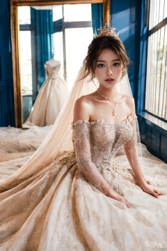 Ultra-clear 8k, real, night, smile, crown, necklace, perspective, hanger, nudity, diamonds, bridal veil, Golden wedding dress, 1 girl,