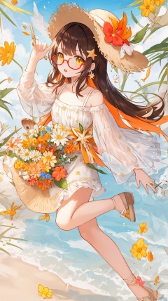 apple_caramel,(absurdres, highres, ultra detailed, 1girl, solo, extremely detailed eyes, starfish, seashell, shell, flower, hat, hair ornament, jewelry, straw hat, looking at viewer, sunglasses, hat flower, drinking straw, hairclip, earrings, red flower, tinted eyewear, yellow flower, bangs, english text, multicolored hair, orange flower, black hair, ring, cup, long hair, orange-tinted eyewear, food, brown hair, portrait, shell hair ornament),full body., ((poakl)), poakl ggll girl, Light master