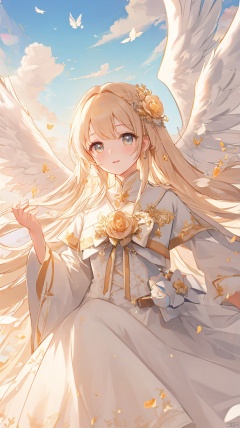 apple_caramel,An angel with white wings spreading wide, her gaze filled with love and compassion. Her hair is golden, dressed in a white gauzy dress, appearing exceptionally holy under the sunlight. The surrounding environment is peaceful, with light clouds floating around. High-definition picture of an angel with open wings, divine aura, golden hair, white dress, serene cloudy background, majestic oil painting by celestial artists, trending on ArtStation, vibrant, sharp focus, photorealistic painting art by hi-res masters.