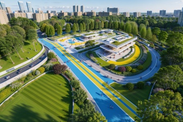 (colourful ground:1.5),(white line:1.5),(Aerial view:1.5), blue road,day,tree,sunlight,HDR,UHD,8K,best quality,masterpiece,Highly detailed,Studio lighting,sharp focus,HDR-based rendering,extreme-description,Beautiful composition,a peaceful atmosphere,advanced sense,Comfortable scale,creative layout,gravel,Rich plant groupings,Richly layered space with plenty of functional space,Best Lighting,(colourful line:1.5)