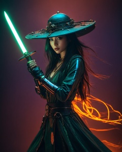 glamour portrait photo, macro, a captivating vibrant dark green-neon capturing the essence of a cyborg Bedouin sorcerer in fight stance, defying expectations by conjuring a whimsical robot 'freak' from an oversized sedge hat. ethereal, smoky backdrop. throwing a translucent orange/tanslucent purple/black iaidow, weapon, katana, holding sword, 100mm f/2.8 macro lens, atmospheric haze, Film grain, cinematic film still, shallow depth of field, highly detailed, high budget, cinemascope, moody, epic, OverallDetail, gorgeous, 2000s vintage RAW photo, photorealistic, candid camera, color graded cinematic, eye catchlights, atmospheric lighting, skin pores, imperfections, natural, shallow dof