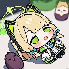 lying-on-back, chibi, full body, 1girl, (masterpiece),(best quality),1girl,midori \(blue archive\),blue archive,aiamu iamu,holding food,holding,hooded jacket,food,sidelocks,:d,collared shirt,blurry,long sleeves,puffy sleeves,headphones,blue bow,hand up,necktie, halo,looking at viewer,jacket,sleeves past wrists,blush,nail polish,blue necktie,animal ear headphones,blurry background,blonde hair,shirt,green eyes,hood down,open clothes,depth of field,hood,smile,white jacket,fake animal ears,bow,puffy long sleeves,open jacket,solo,dress shirt,animal ears,white shirt,blue nails,hair bow,long hair,drawstring,sweet potato,