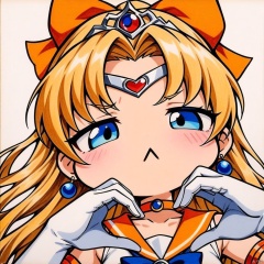 close-up, chibi, :<, (masterpiece),(best quality),1girl,sailor venus,masterpiece,best quality,very aesthetic,absurdres,aavenus,long hair,blonde hair,hair bow,tiara,blue eyes,earrings,orange choker,collarbone,orange sailor collar,blue bowtie,white shirt,white leotard,elbow gloves,white gloves,pleated skirt,orange skirt,heart hands,traditional media,