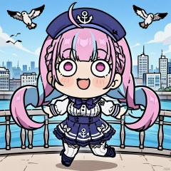 style-parody,chibi,full_body,(masterpiece),(best quality),1girl, solo, virtual youtuber, multicolored hair, minato aqua, long hair, skirt, braid, looking at viewer, twin braids, bird, bangs, blue hair, outdoors, pantyhose, long sleeves, purple eyes, hat, pink hair, blue skirt, twintails, ahoge, two-tone hair, blush, bow, sailor collar, shirt, hairband, white jacket, pleated skirt, jacket, railing, white pantyhose, breasts, ribbon, white shirt, blue sky, day, streaked hair, open mouth, frills, blue sailor collar, sky, seagull, high-waist skirt, choker, blue bow, red flower, open clothes, standing, colored inner hair, hand up, bowtie, open jacket, collarbone, anchor symbol, cityscape, smile, blue nails