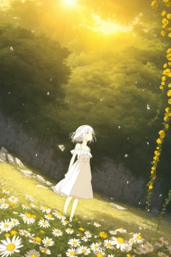 (masterpiece),(best quality),illustration,ultra detailed,hdr,Depth of field,(colorful),loli,yellow theme,the setting sun,Chamomile,Chamomile,cornflower,vines,forest,ruins,lens flare,hdr,Tyndall effect,damp,wet,1girl,bare shoulders,broken glass,broken wall,white hair,white dress,closed mouth,constel lation,flat color,braid,blinking,white robe,float,closed mouth,constel lation,flat color,looking up,standing,medium hair,standing,solo,