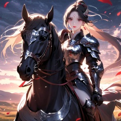 1girl, solo, long hair, looking at viewer, black hair, hair ornament, gloves, jewelry, closed mouth, ponytail, earrings, outdoors, sky, black gloves, cloud, hair bun, armor, petals, makeup, facial mark, shoulder armor, breastplate, forehead mark, red lips, riding, horse, falling petals, horseback riding