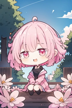 1girl, solo, outdoors, scenery, flower, pink_hair, looking_at_viewer, jacket, multicolored_hair, sitting, sky, smile, long_sleeves, red_eyes, white_hair, open_mouth, tree, black_footwear, pink_flower, day, short_hair, off_shoulder