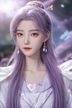 best quality,masterpiece,1girl,solo,long hair,looking at viewer,jewelry,closed mouth,purple eyes,upper body,purple hair,earrings,blurry,blurry background,sunlight,red lips,(big breasts:1.59), Yunxiao_xianzi, Brigitte Lin, X-aurora, pearl_shell, song_hanfu, fantasy_butterfly