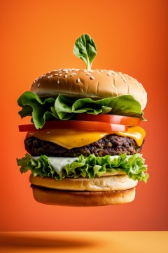 Food photography,a vibrant and dynamic hamburger against an orange backdrop. The burger is layered with fresh ingredients such as lettuce,tomatoes,cheese,and onions. There are floating elements like lettuce,and cucumber slices,giving a sense of movement and freshness. The overall ambiance is lively,(capturing the essence of a delicious meal in mid-air:1.3),, masterpiece,best quality,