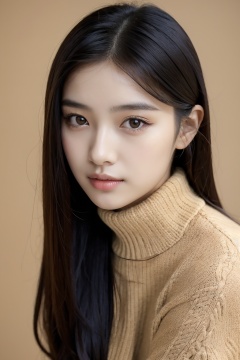1girl,asians,a young woman with long,straight dark hair. She has a fair complexion and is gazing directly at the camera. She is wearing a knitted sweater with a patterned design,predominantly in beige and black tones. The background is plain,ensuring the viewer's focus remains on the subject.,, masterpiece,best quality,