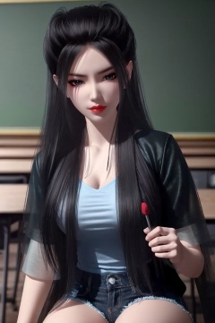 ((HRD, HUD, 8K)),((masterpiece, best quality)), highly detailed, 1girl, solo, black hair, long hair, lips, red lips, makeup, (t-shirt:1.2), (blazer:1.2), denim shorts, blurry background, classroom, chalkboard, sitting, cowboy shot, looking at viewer, <lora:20240518-1715992227646:0.7>