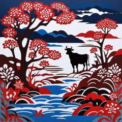 masterpiece,high quality,paper-cut art,nobody,solo,paper-cut style,cattle,river