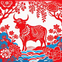 paper-cut art,a big red flower,paper-cut style,Chinese style,Chinese year,festive,cattle,river