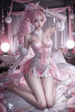 solo,1girl,dress,pink skirt,high ponytail,pink-haired girl \(kay yu\),high heels,bunny ears,thigh gap,<lora:future0516-xiaowu:0.8>,bedroom,wariza,, best quality,masterpiece,highres,official art,extremely detailed cg unity 8k wallpaper,