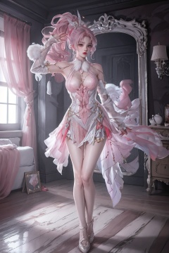 solo,1girl,dress,pink skirt,high ponytail,pink-haired girl \(kay yu\),high heels,bunny ears,thigh gap,standing,<lora:future0516-xiaowu:0.8>,bedroom,seiza,, best quality,masterpiece,highres,official art,extremely detailed cg unity 8k wallpaper,